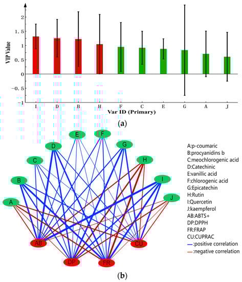(a): The VIP value derived from OPLS analysis characterized the correlation value of the antioxidant capacity. A VIP value greater than 1.0 means significant correlation to the antioxidant capacity. (b): Correlations between antioxidant capacities and phenolic compounds in seven peach cultivars. The width of the line is proportional to the strength of the correlation.
