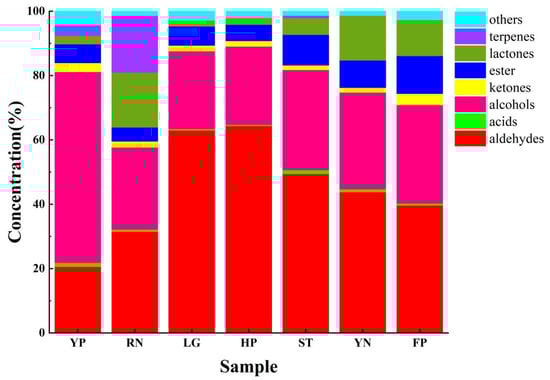 The fruit of separate cultivars, or even the same cultivars, have different volatile components, and the respective compositions and concentrations of volatile compounds endow the fruit with distinctive flavors [,]. The volatile organic compounds (VOCs) of peaches were analyzed by the HS-SPME–GC–MS method and the results showed that in sum, 69 aroma compounds were identified and quantified. These compounds can be classified according to chemical structure, including 11 alcohols, 18 aldehydes, 3 acids, 6 ketones, 15 esters, 8 lactones, 4 terpenes, and 4 other compounds. A sum of 37 volatiles were present in YP, 46 volatiles in RN, 41 volatiles in LG, 31 volatiles in HP, 38 volatiles in ST, 44 volatiles in YN and 37 volatiles in FP, respectively (Supporting Information Table S1). Alcohols and aldehydes had the most abundant relative contents in all the peaches, representing 20.64 to 64.43% and 24.20 to 59.30% of the total VOC content, respectively. Furthermore, the concentrations of volatile compounds differed largely among the seven cultivars (Figure 3).