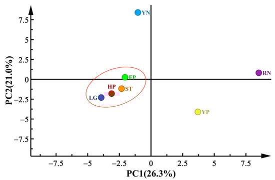 PCA analysis of aroma compounds. Differences in the flavor compounds in flat peach (FP), liguang peach (LG), honey peach (HP), yellow peach (YP), yellow nectarine (YN), red nectarine (RN) and shoutao (ST) from shihezi, Xinjiang.