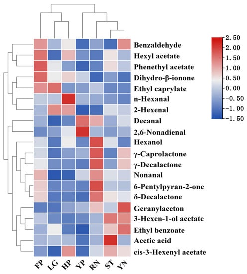 The main aroma components in peaches of different cultivars were investigated by cluster heat-map analysis. The 20 common volatile compounds were analyzed by constructing a heat map. According to the results of the sample cluster, the seven peach cultivars were clustered into two categories based on the difference in the concentration of volatile compounds (Figure 5). There were different characteristic odors in each cluster. Among them, the ST, YN, YP and RN had the prominent sweet, typical green and nutty flavors and FP, LG and HP had the characteristic floral, citrus and fatty aromas. Among all the aroma compounds, lactones have the distinctive peach odor, which is one of the crucial aroma characteristics that distinguish peach from other fruits.