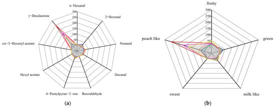 A total of twenty common aroma compounds were identified, but not all of them contributed significantly to the aroma of the peaches; only those with an OAV above 1 were considered important to the aroma []. The odor activity value (OAV) is the ratio of the volatile compound concentration to the odor threshold (OT), and is used to distinguish which compound contributes more to fruit aroma. Only two of the esters found to be volatile in the seven cultivars had OAV values above 1—hexyl acetate and cis-3-hexenyl acetate—indicating that they played a significant role in the fruity and floral notes of the peach. Although other often-found esters had distinctive smells as well, their contributions to the peach aroma were minimal because of their low concentrations and high odor sensitivities. For the common lactone volatiles, γ-decalactone was reminiscent of a fruity, pleasant and peach-like odor and had a relatively low odor threshold (0.7 µg/kg), so it had OAVs ranging from 8.77 to 252.17 (Table 7), making it a crucial contributor to the peach aroma among the lactones. For the other lactones, δ-decalactone is characterized by a coconut odor and flavor and γ-caprolactone is characterized by a creamy and nutty caramel odor, but their OAVs in the seven cultivars were below 1. Especially, according to reports, γ-decalactone is a key component in the creation of the distinctive peach-like scent [].