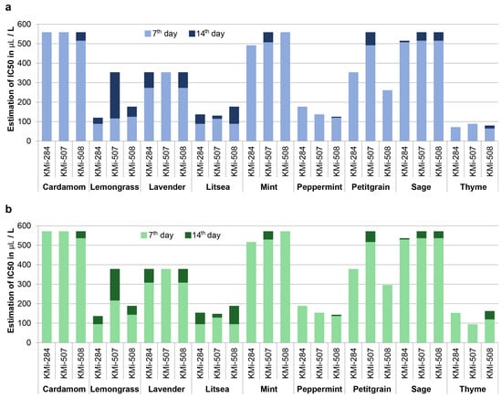 We estimated concentrations that inhibited B. cinerea growth in 50% or 90% of cases (IC50 and IC90) by probit analysis for each fungal strain and EO (Figure 1). The values of IC50 varied greatly among EOs, as well as among strains, which possess different reactions of particular strain to EO treatment. For example, the strain KMi-507 was the most sensitive to the presence of thyme EO (IC90 = 94.61 μL·L−1), but it was the most resistant to litsea EO treatment (IC90 = 128.65 μL·L−1) on the 7th day. IC90 values were not very different from IC50, suggesting that the threshold for growth inhibition is relatively sharp and the cessation of growth occurs relatively shortly after the specific concentration of EO in the vapor phase is reached. The lowest values of IC50 were detected for thyme EO, followed by litsea, mint, and lemongrass. They were substantially more effective than lavender, petitgrain, and sage EOs.