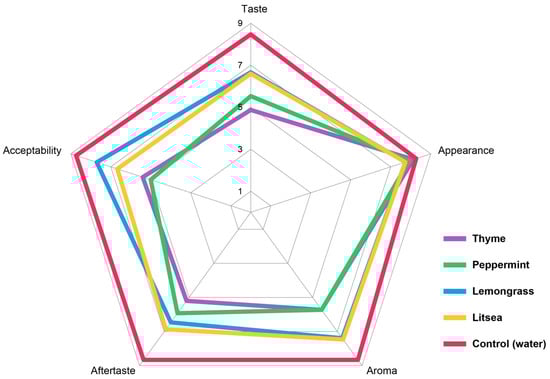 In terms of statistical significance (p < 0.05), the best sensory quality in terms of taste, aftertaste, and overall acceptability was achieved by the control sample (Supplementary Table S2). The treatment of samples with EOs did not show a statistically significant change in the appearance of the samples. All of the samples had a fresh appearance, the fruits were shiny, and the stem of the fruit was green and unadulterated. Sample treatment by EOs resulted in statistically significant differences in taste, aftertaste, aroma, and overall quality (Figure 2). In the aroma trait, the best results were achieved by samples treated with lemongrass EO. It was characterized by a dominant strawberry aroma. In the samples treated with peppermint and thyme EOs, the scores dropped to 5.73 and the evaluators described the aroma of these samples as pleasant, but the typical strawberry aroma was overpowered by the EO.