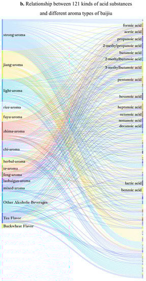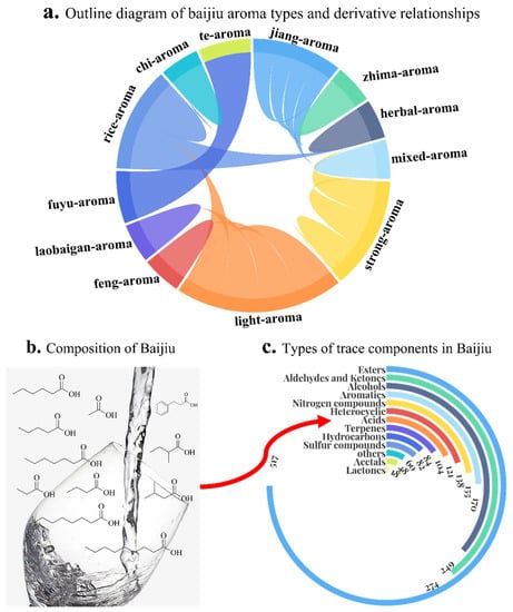 Baijiu is the national liquor of China, which carries the special emotions of Chinese people; thus, baijiu becomes an indispensable drink for Chinese people in places such as festivals and gatherings. Baijiu is made of sorghum, corn, and other grains []. Under the action of Jiuqu (a saccharification-and-fermentation starter) during solid-state fermentation, baijiu is extracted and distilled in a retort (a device for distilling baijiu). After ripening (a kind of storage method that makes baijiu taste better), baijiu is blended by technicians and forms a kind of alcoholic beverage unique to China []. At present, baijiu is divided into twelve aroma types, namely strong-aroma (also named as nong-flavor baijiu), jiang-aroma (also named as moutai-aroma or sauce-aroma baijiu), light-aroma, rice-aroma, zhima-aroma (also named as sesame-aroma baijiu), fuyu-aroma, laobaigan-aroma, chi-aroma, herbal-aroma (also named as dong-aroma or drug-aroma baijiu), te-aroma, mixed-aroma (also named as strong-sauce-aroma or miscellaneous-flavor baijiu), and feng-aroma [,]. The twelve aroma types of baijiu embody the wisdom of Chinese people. Of note, there is a certain relationship between the twelve kinds of aroma types of baijiu; the specific relationship is shown in Figure 1a. Among them, jiang-aroma, strong-aroma, light-aroma, and rice-aroma types are considered to be the basic aroma types of baijiu. The remaining eight aroma types of baijiu are derived from the four basic aroma types of baijiu. With the innovation of technique, the aroma type is no longer a constraint, and many other aroma types of baijiu have also begun to appear []. Baijiu circulating in the market is still dominated by these 12 kinds of aroma types of baijiu.