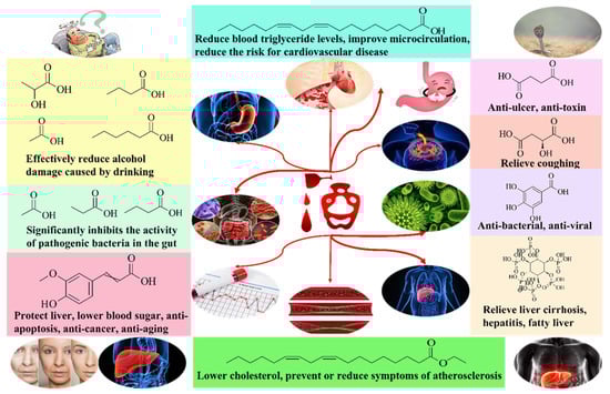 Many years ago, “blending of flavor” baijiu produced by some manufacturers appeared in the Chinese market. After drinking, consumers felt thirst, dizziness, and took other side effects, and the body recovered slowly, thereby affecting the subsequent work and rest []. It has been found out that the main reason was that the proportion of acid, ester, alcohol, and aldehyde in the baijiu was not coordinated, especially the lack of acid and ester []. Therefore, baijiu contains coordinated acids and esters, which is not only a requirement for flavor quality, but also has a certain function. Acid substances are the important material basis of baijiu quality. Of note, acid substances (including esters formed by acid substances and ethanol) can not only affect the color, aroma, and taste of baijiu, but also make baijiu have a positive impact after drinking [,,]. The structure diagram of functional acid substances in baijiu and their main functional descriptions are shown in Figure 2 [,,].