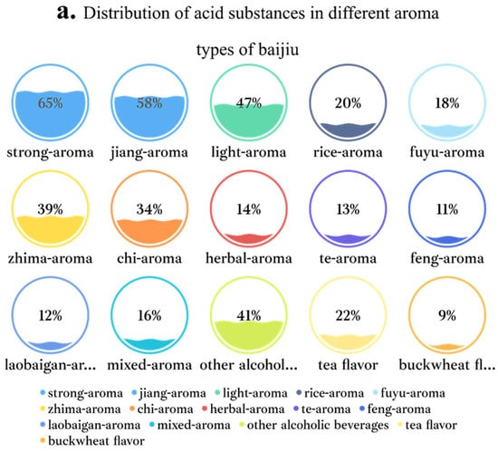 The distribution of acid substances in different baijiu aroma types is shown in Figure 3. Combined with Figure 3 and the above mentioned, it can be found that the three aroma types of baijiu (i.e., strong-aroma, jiang-aroma, and light-aroma) are very rich in acid substances. Furthermore, they are currently the three most representative aroma types of baijiu. Therefore, it can be speculated that acid substances have a huge impact on baijiu quality.