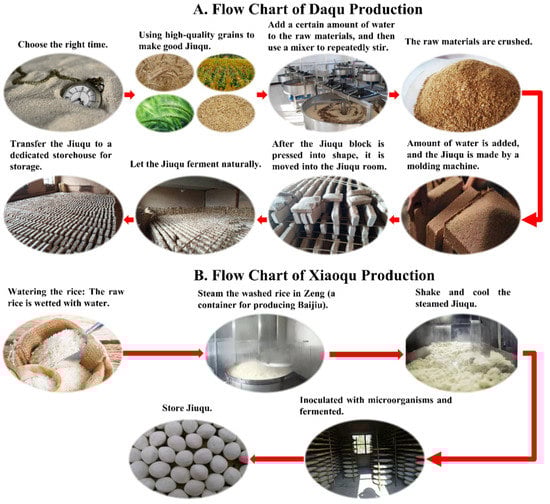 The general Jiuqu applied in the baijiu industry mainly includes Daqu and Xiaoqu. The specific production process is shown in Figure 5 below. Daqu, also known as Kuaiqu or Zhuanqu, as shown in Figure 5, uses wheat, barley, or peas as raw materials, is crushed, kneaded with water, pressed into a brick-like qu billet, and enriched with various microorganisms from nature. According to its culture temperature, it can be divided into high temperature Daqu, medium temperature Daqu, and low temperature Daqu. Xiaoqu mostly uses rice flour or rice bran as raw materials, and sometimes adds Chinese herbal medicine as auxiliary materials, and is cultivated under the conditions of temperature and humidity control. It is called “Xiaoqu” because of its small size [,,,].