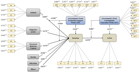 Meanwhile, this study controls the personal characteristics that may affect the willingness to consume organic food, including gender, age, education background, monthly income level, the number of elderly and children in the family, the number of chronic diseases, etc. The moderator variable “government’s food production support work” has a moderating effect on the paths in which behavior attitude and perceived behavior control affect consumption willingness, and the moderator variable “government’s food consumption guarantee work” has a moderating effect on the path of consumption willingness, affecting consumption behavior (Figure 1).