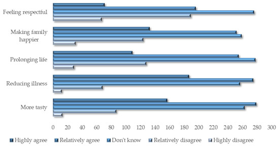 This study proves that an increase in income will promote the willingness to consume organic food. This finding is similar to that in Zámková et al.’s study [51]. With reference to the study of Fish et al. [9], this may indicate that high-income people have both the ability to purchase high-end food and stronger health demand. Although the number of elderly family members and children has a positive impact on the willingness to consume organic food, the value is small (β = 0.007). The influence of chronic diseases suffered by individuals and family members on the consumption willingness of organic food (β = 0.073) is even higher than that of attitude (β = 0.065), reflecting that the health concepts of Chinese residents are still relatively backward; that is, the illness can stimulate the consumption desire of organic food, and the attention paid to ordinary health maintenance is insufficient. According to the answers to the alternative questions in this study (Figure 3), most of the respondents agree that organic food tastes better and can reduce diseases, but are noncommittal regarding whether eating organic food can prolong life, or make families happy and feel honored. More than 30% of the answers to each question are “I don’t know”, reflecting that the respondents have an unclear understanding of the effects and purpose of eating organic food, which once again illustrates the importance of scientific publicity.