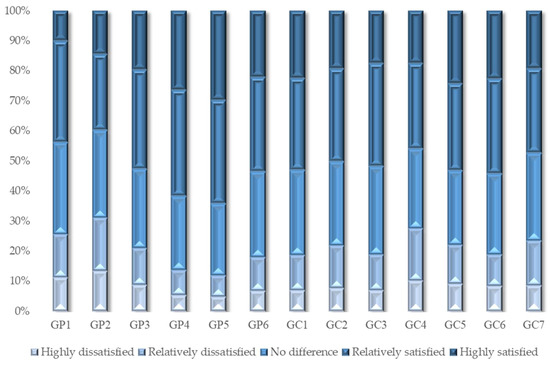Figure 5 shows the evaluation results of respondents’ satisfaction with the government’s supervision in the entire chain. The respondents are dissatisfied with the government’s work in the supervision of livestock and poultry drugs (GP1), that of fertilizers and pesticides (GP2), and the regulation of outer packaging (GC2), food processing (GC4), and food charity (GC7). These are the key links and regulatory difficulties of food safety, and are the guidelines for improving government work in the future. Respondents are highly satisfied with the government’s work in improving the rural environment (GP4), supporting agricultural science and technology (GP5), perfecting laws and regulations (GC5), and strengthening food safety publicity (GC6), which are also key areas that China has focused on in recent years. In particular, after years of governance, respondents’ satisfaction with the government regulation of food safety certification and traceability (GC1) has exceeded 50%. In conclusion, the respondents’ satisfaction with the government’s efforts to improve the agricultural and rural environment, support agricultural science and technology, and support farmers made up for their dissatisfaction with the supervision of livestock and poultry drugs, pesticides, and fertilizers, making the overall moderating effect of GP positive. The role of strict laws and credible certification in enhancing consumer confidence enables the government’s food consumption guarantee work (GC) to promote the conversion of residents’ willingness to consume organic food into behavior.