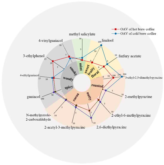 Pyrazines and furans were reported as the largest shares of volatiles in coffee [25], mainly formed by the Maillard reaction during coffee bean roasting [3]. As key contributors to coffee aroma, OAVs of total pyrazines accounted for over 60% of 13 aroma-active compounds, whose contribution in cold brew coffee was almost as twice as that of in hot brew coffee (Table 1), among which, 2-methylpyrazine was only detected in cold brew coffee, requiring further study to be clarified. Although abundant in coffee, furans made limited contributions to coffee aroma, due to relatively high recognition thresholds of furans [3]. Only the furfuryl acetate was identified as aroma-active furan (Figure 1), with higher OAV of 4.23 in cold brew coffee than in hot brew coffee. Generally, the high temperature increased the saturated vapor pressure, thereby adding the losses of volatile compounds [26]. It can be used to explain higher contents of pyrazine and furan compounds in cold brew coffee, which was consistent with previous studies [9]. Moreover, 4-ethylguaiacol, 3-ethylphenol, 4-vinylguaiacol, and guaiacol, as common phenolic volatiles identified as aroma-active compounds of coffee, were produced from the degradation of chlorogenic acids during green coffee bean roasting [3]. Different phenolic volatile change tends were observed between hot and cold brew coffee, which could be explained in that brewing methods could affect concentrations of these compounds through both the extraction temperature and time.