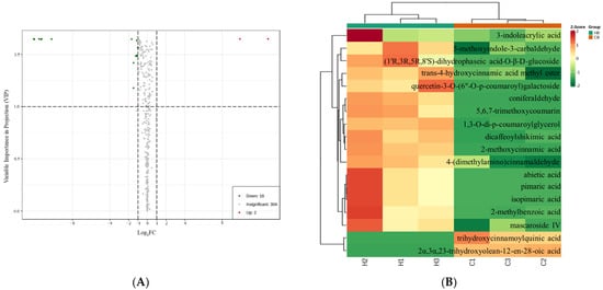 Volcano plot (A) and hierarchical cluster analysis (B) of differential non-volatiles identified between hot and cold brew coffee. (A) Red dots represent differential compounds of which the abundance was upregulated; green dots represent differential compounds of which the abundance was downregulated; and gray dots represent compounds with insignificant differences. If the abscissas had large absolute values, the FC values were also observed to be large. (B) Red represents a relatively high content of the compound, whereas green represents a relatively low content. HB: hot brew coffee; CB: cold brew coffee.