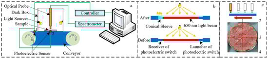 The online NIRS system developed in this study mainly includes two pairs of photoelectric sensors, a conveyor, a microprocessor (STM32F103C8T6, STMicroelectronics Inc Geneva, Switzerland,), a NIR spectrometer (900–2500 nm, NIRQuest512, Ocean Optics Inc., Dunedin, USA), two halogen lamps (MR11 20W, Philips Inc., Amsterdam, The Netherlands), a single optical fibre probe (QP400-1-vis-nir, Ocean Optics Inc., Dunedin, USA), a PC machine, and a self-designed software. Its structural schematic diagram is shown in Figure 1a. The speed of the conveyor was set as 8 cm/s according to the preliminary research results of our laboratory and the existing reports on online detection [28,29,30]. The halogen lamps were installed on both sides of the dark box, and the installation angle was set to 30° to the horizontal plane. The vertical distance between the probe and the sample surface was 1.5 cm. The interval time of 4 collection points of each sample was determined by the time interval of the rising and falling edge of the signal from photoelectric sensor 1 (Figure 1a). Photoelectric sensor 2 was used to detect the arrival signal of the sample and send it to the control software, to drive the spectrometer to collect the spectral data of the sample. Due to the interference of light sources on the photoelectric sensor signal, two pairs of 5 V laser sensors with a beam of 650 nm were applied in this system and a conical sleeve was adopted to reduce the influence of light sources, as shown in Figure 1b.