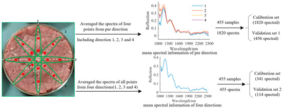 Before the acquisition of spectra, the NIRS system needed to be preheated about 30 min. In this study, the integral time, smoothness, and scanning times of the NIRS acquisition system were set to 40 ms, 5 times, and 10 times, respectively. The whiteboard (USRS-99-010, Labsphere Inc., Sutton, NH, USA) was used to perform white calibration of the spectrometer, and the light source was turned off for black calibration. The reflection spectra of four points in the run direction of the sample were automatically collected according to the sample size. To study the influence of the spectral information on the classification model, spectra of four directions (1, 2, 3, and 4) at 45° intervals were collected for each sample, as shown in Figure 2. The obtained spectral data were saved as a CSV file for further data processing. A total of 455 samples were used for collecting the spectral information. First, the spectra of four points per direction (including direction 1, 2, 3, and 4) were averaged to obtain the mean spectral information per direction, and a total of 1820 spectra were obtained for 455 samples. Based on the mean spectral information of the four directions, a total of 455 samples were divided into 341 samples for the calibration set and 114 samples for the validation set by the joint x-y distances algorithm, which was first proposed by Galvao et al. [31], and its principle is to calculate the distance between samples by using two variables, label value and spectrum, to ensure the maximum distribution of samples, to effectively cover the multidimensional vector space, to increase the difference and representativeness between samples, and to improve the stability of the model. On this basis, 1820 mean spectra per direction were divided into 1364 spectra for the calibration set and 456 spectra for the validation set. Two kinds of spectral information were used to establish models, and two validation sets from different spectral information were used to test the classification performance.