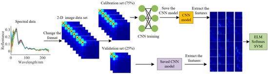 In this study, CNN models with the classifiers of Softmax, ELM, and SVM were established on the basis of a 2D spectral information matrix. The best model for classification of adulterated mutton was selected by comparing the performance of the models. The schematic diagram of the data process is shown in Figure 3.