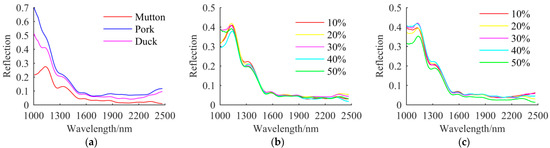 Mean reflectance spectrum of (a) pure meat; (b) adulterated samples at different percentages with pork; (c) adulterated samples at different percentages with duck meat.