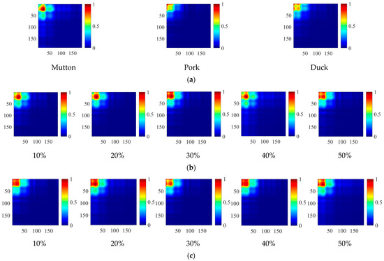 Two-dimensional (2D) spectral information matrixes of (a) pure meat; (b) adulterated mutton with pork in different proportions; (c) adulterated mutton with duck in different proportions.