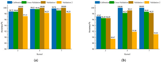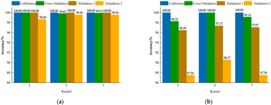 The results of CNN-Softmax models are shown in Figure 6. It could be found that the size of the convolution kernel had little effect on the performance of the models. When the mean spectral information per direction was used to establish the model, the accuracy of all datasets was higher than 97%. By comparing the results of validation sets, the performance of the model with the convolution kernel of 3 × 3 was slightly lower than those with the other two convolution kernels. When the sizes of the convolution kernel were set as 5 × 5 and 7 × 7, the accuracy of validation set 1 and 2 for the two models was the same. By comparing the accuracy of cross-validation sets for the two models, it could be found that the model had the highest accuracy when the size of the convolution kernel was set as 5 × 5, of which the accuracy for validation set 1, validation set 2, and the cross-validation set was 100.00%, 98.25%, and 99.56%, respectively. Similarly, it could be obtained that the accuracy of the model with the size of the convolution kernel of 5 × 5 was highest when the mean spectral information of the four directions was used for modelling, and the accuracy of validation set 1, validation set 2, and the cross-validation set was 99.12%, 91.86%, and 98.25%, respectively.