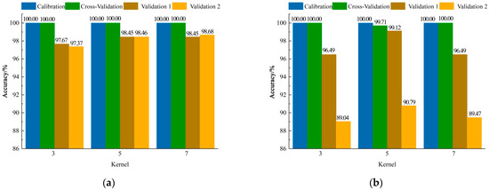 Figure 7 shows the results of CNN-SVM models. When the mean spectral information per direction was used for modelling, the accuracy of calibration sets and cross-validation sets for all models was 100.00%. It was found that the classification performance of the model with the 3 × 3 convolution kernel sizes was lowest by comparing the accuracy of validation sets, and when the sizes of the convolution kernel were set as 5 × 5 and 7 × 7, the accuracy of the cross-validation set and validation set 1 had the same results. However, it could be found that the accuracy of the model with the convolution kernel of 7 × 7 was highest by comparing the accuracy of validation set 2, and its accuracy of validation set 1, validation set 2, and the cross-validation set was 98.45%, 98.68%, and 100.00%, respectively. Similarly, the classification accuracy of the model with the convolution kernel size of 5 × 5 based on the mean spectral information of the four directions was highest, and the accuracy of validation set 1, validation set 2, and the cross-validation set was 99.12%, 90.79%, and 99.71%, respectively.