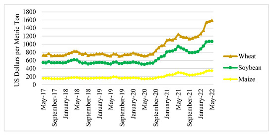 Global food prices showed an increasing trend between May 2017 and May 2022 (Figure 5). From 2017 to 2019, global food prices had a history of stability. However, food prices began to rise in 2020 and 2021. Wheat and maize prices increased each month dramatically by 2.17% and 2.59%, respectively. During the same period, the price of soybeans increased by 1.73% per month [28].