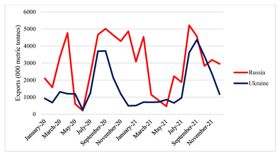 Export quantity of Russian and Ukrainian wheat in 2020 and 2021. Source: [30].