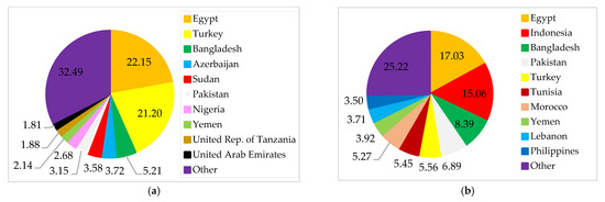 The final destinations of Russian wheat exports are spread across several countries in Europe, Asia, and Africa (Figure 7). The primary destinations for Russian wheat exports are Egypt, Turkey, and Bangladesh. These three countries are also Ukrainian export destinations. Russia and Ukraine provide wheat to many Least Developed Countries (LDCs) and Low-Income Food-Deficit Countries (LIFDCs). Overall, more than 30 net wheat importers in North Africa and Western and Central Asia depend on both countries for over 30% of their wheat import needs [31]. Most interestingly, Russia and Ukraine are among Yemen’s sources of wheat. Yemen is in danger of famine because of a conflict, a drought, and a reliance on imported wheat [26,32]. In this sense, Yemen’s food security will suffer if the supply of wheat from Russia or Ukraine is disrupted.