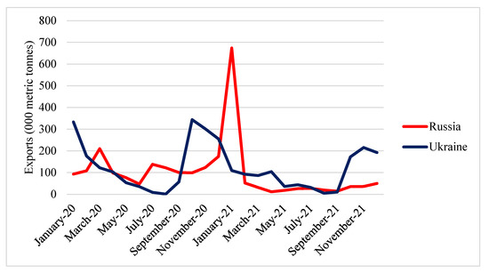 Ukraine and Russia are also significant exporters of maize. The trend of maize exports from Ukraine indicates a rise in 2020 and 2021. Meanwhile, Russian maize exports mainly remained stable during that period. Ukrainian maize exports peaked at the beginning and end of the year. Meanwhile, Russian maize exports peaked in February and April (Figure 12).