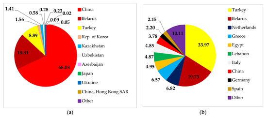 The role of Ukraine and Russia was seen to be significant in fulfilling Belarusian import demands for soybeans (Figure 11). More soybeans are imported into Belarus from Ukraine than from Russia. On the other hand, both countries’ contributions to fulfilling China’s and Turkey’s demands were less significant. Ukraine met the needs of 20.21% and 0.06%, while Russia met 2.17% and 0.69%, respectively.
