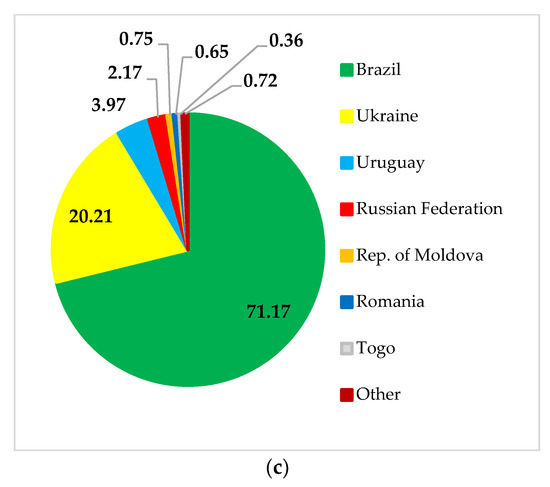 China’s (a), Belarus’ (b), and Turkey’s (c) soybean import structure. Source: [30].
