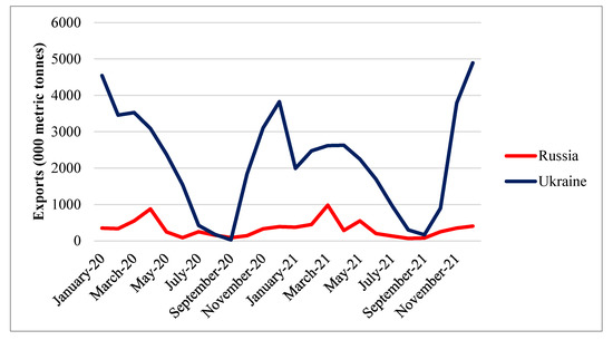 The Russian Federation and Ukraine are significant food suppliers in the global market. The peak of wheat exports from both countries occurred in July and August. The Russian Federation was the top global wheat exporter, shipping 32.9 million tons of wheat and meslin (in product weight), or 18% of international shipments (Figure 6). With 20 million tons of wheat and meslin exported in 2021 and a 10% market share worldwide, Ukraine was the sixth-largest wheat exporter [29]. Wheat exports from both countries also continue to increase yearly.