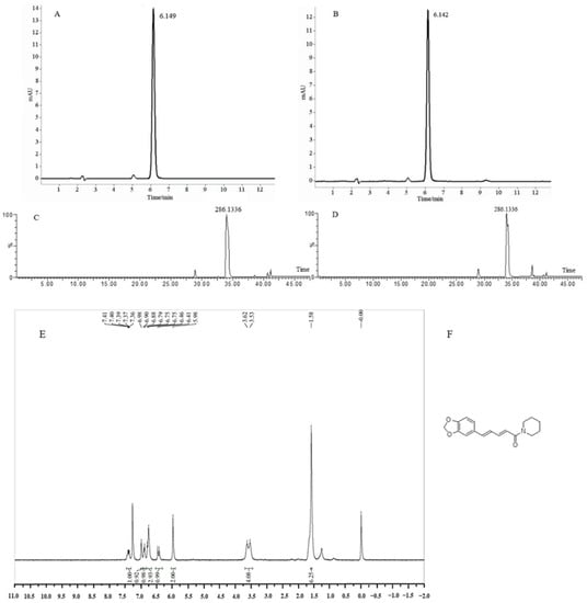 HPLC and UPLC-Q-TOF-MS analysis of piperine. (A) HPLC results of standards piperine; (B) HPLC results of sample piperine extraction from white pepper; (C) UPLC-Q-TOF-MS results of standards piperine; (D) UPLC-Q-TOF-MS results of sample piperine extraction from white pepper; (E) 1H NMR results of sample piperine extraction from white pepper; (F) Structural information of piperine extraction from white pepper.