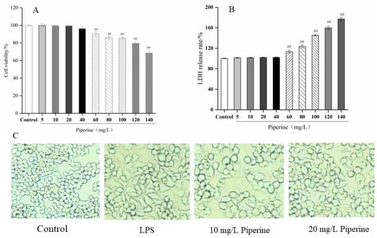 Cell viability reflected the extent to which cells are injured by the external environment. As shown in Figure 2A,B, when the mass concentration of piperine was less than 40 mg/L, piperine showed no significant influence on cell viability (99.40–100.00% cell viability; 100.00–102.25% LDH release rate). When the mass concentration of piperine was 60 mg/L, the cell viability declined to 90.43 ± 2.11%, which was significantly lower than that of the control group. The release rate of LDH increased to 113.44 ± 2.52%, which was significantly higher than that of the control group (p < 0.01). Piperine displayed no cytotoxicity in RAW264.7 murine macrophages when concentrations were below 40 mg/L, which was similar to Hou’s research [12] but different from Ying’s results [13]. Different sources, components and purities of piperine could be considered the reason for these results. As a result, piperine at concentrations of 10 and 20 mg/L was chosen for future study.