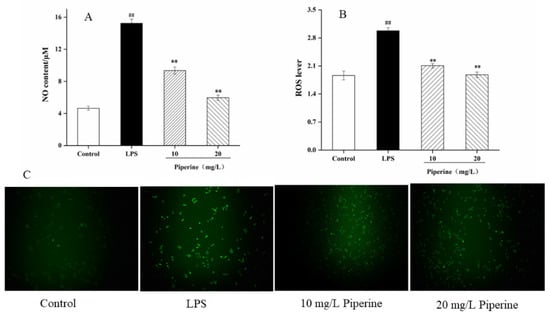 Piperine suppressed the secretion of NO and ROS. (A) NO secretion; (B) ROS lever analysis of intracellular formation; (C) ROS measured by Fluorescence microscopy. Ave ± SD ## p < 0.01 vs. control group; ** p < 0.01 vs. LPS group.