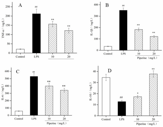 Inflammatory cytokines, such as TNF-α, IL-1β, IL-6 and IL-10 are closely linked to inflammation. As expected, the contents of TNF-α, IL-1β and IL-6 in the LPS group were much higher than those in the control group (p < 0.01), while IL-10 had the opposite result (p < 0.05) (Figure 4A–D). When the cells were pretreated with 10–20 mg/L piperine, the production of TNF-α, IL-1β and IL-6 was dramatically decreased in comparison with that in the LPS group, and IL-10 had the opposite effect. Meanwhile, after treatment with piperine (20 mg/L), the TNF-α, IL-1β and IL-6 contents were decreased by 42.92%, 65.50% and 35.42%, respectively (Figure 4A–C), but the IL-10 content was increased by 195.31% (Figure 4D). This result showed that LPS significantly improved the secretion of TNF-α, IL-1β and IL-6 compared with the control. Piperine downregulated the production of TNF-α, IL-1β and IL-6 and upregulated the secretion of IL-10. According to the results, the anti-inflammatory action of piperine was closely related to the regulation of the production of inflammatory factors.