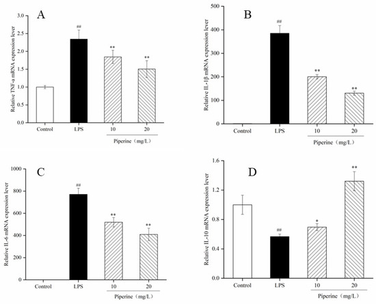 Piperine-inhibited LPS-stimulated TNF-α (A), IL-1β (B), IL-6 (C) and IL-10 (D) mRNA expression levels in RAW264.7 cells. Ave ± SD, ## p < 0.01 vs. control group; * p < 0.05 and ** p < 0.01 vs. LPS group.