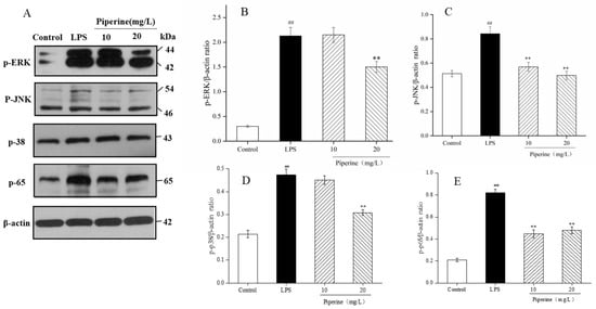 MAPK is a group of serine/threonine-specific protein kinases that are involved in the initiation of macrophage NF-κB activation after cell stimulation. In mammalian cells, there are three representative MAPK pathways: extracellular signal-regulated kinase (ERK), c-Jun-N-terminal kinase (JNK), and p38 [25,26]. The protein expression levels of p-ERK, p-JNK and p-p38 were increased dramatically upon stimulation by LPS compared to the control (Figure 6A–D), which was similar to the finding of Gao [27]. In addition, when the concentration of piperine was 10 mg/L, the effect of p-JNK decreased significantly, while the degree of p-ERK and p-p38 was not obvious. After treatment with 20 mg/L piperine, the levels of p-ERK (Figure 6B), p-JNK (Figure 6C) and p-p38 (Figure 6D) were markedly decreased (p < 0.05). In the p-ERK assay, the protein level increased from 0.30 ± 0.02 to 2.13 ± 0.17 after LPS induction and decreased to 1.51 ± 0.11 with 20 mg/L piperine (Figure 6B). In the p-JNK assay, the protein level increased from 0.51 ± 0.03 to 0.84 ± 0.06 after LPS induction and decreased to 0.49 ± 0.03 with 20 mg/L piperine (Figure 6C). In the p-p38 assay, the protein level in the cells increased from 0.21 ± 0.02 to 0.47 ± 0.03 after LPS induction and decreased to 0.31 ± 0.01 in the 20 mg/L piperine group (Figure 6D). According to the above data, piperine attenuated the degree of phosphorylation of proteins corresponding to the MAPK pathway.