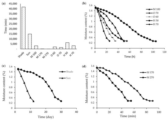 Effect of various drying techniques on the drying time of seedless barberry. (a) Drying time of different methods, (b) Moisture content curve of different methods (microwave, oven and cabinet), (c) Moisture content curve of shade and sun dryer, (d) Moisture content curve of microwave treatments (170 W and 270 W). Microwave 100 W (M 100), Microwave 170 W (M 170), Microwave 270 W (M 270), Oven 60 °C (O 60), Oven 70 °C (O 70), Cabinet 50 °C (H 50), Cabinet 70 °C (H 70).
