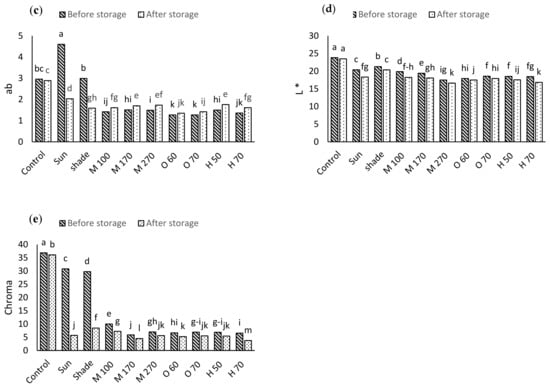 Effect of different drying methods on color indexes (a–e) (a*, b*, ab, L*, and chroma) of Seedless barberry fruits. Microwave 100 W (M 100), Microwave 170 W (M 170), Microwave 270 W (M 270), Oven 60 °C (O 60), Oven 70 °C (O 70), Cabinet 50 °C (H 50), Cabinet 70 °C (H 70). The LSD test shows that bars with various letters are substantially different from one another at p ≤ 0.05.