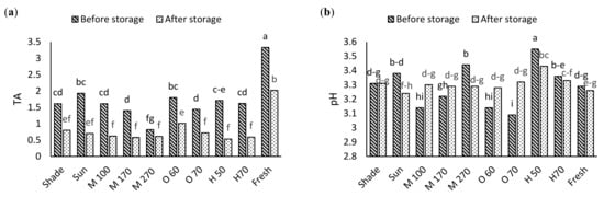 Also, comparing the average interaction effects of drying and storage on TA indicates that all drying treatments, before and after storage, have reduced the titratable acidity compared to the fresh sample (Figure 3a). Our results showed before storage with increasing temperature with oven and cabinet and also with increasing microwave power TA amounts decrease significantly. Figure 3b shows that pH in the 50 °C cabinet treatment was maximum amount (3.55), the lowest pH related to oven treatments (3.09 and 3.14) before storage. The browning reaction forms soluble and insoluble polymers when reducing sugars combine with protein amino acids or other nitrogenous substances. The decreasing of pH is a result of the loss of amino groups and the production of organic acids in this reaction [40].