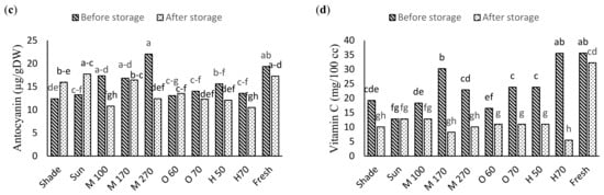 Effect of different drying methods on TA (a), pH (b), anthocyanin (c) and vitamin C (d), of Seedless barberry. Microwave 100 W (M 100), Microwave 170 W (M 170), Microwave 270 W (M 270), Oven 60 °C (O 60), Oven 70 °C (O 70), Cabinet 50 °C (H 50), Cabinet 70 °C (H 70). The LSD test shows that bars with various letters are substantially different from one another at p ≤ 0.05.
