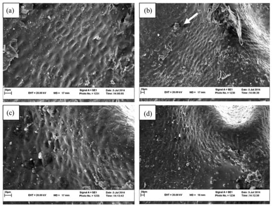 Information about changes in plant microstructures enables us to control the drying process better and improve the product’s appearance. By observing the surface structure of the product, the effects of different drying methods and drying temperatures on microstructural changes of samples can be investigated. As we can see in Figure 4 drying seedless barberry fruit under shade, the surface of seedless barberry samples is less wrinkled, and the smooth texture of the fresh fruit is better preserved. Using the sun method causes the destruction of fruit tissue in some parts, as shown via the white arrow in the Figure 4b.
