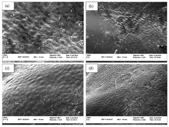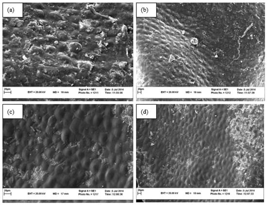 SEM images of Seedless barberry fruit surface structure under different drying methods, (a) Microwave 100 W with magnification 1000; (b) Microwave 100 W with magnification 500, (c) Microwave 270 W with magnification 1000; (d) Microwave 270 W with magnification 500.