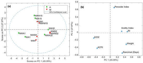 Scores (a) and loadings (b) plots of the PCA model obtained with physicochemical parameters, Ripening Index (RI), oxidative stability (Rancimat results) of the Organic Extra Virgin Olive Oil samples (OEVOOs) analyzed according to the washing (W) or non-washing (NW) process, the time of collection (Morning-M or Afternoon-A), and maturation stage (I–III). Stage I (collection day 1), stage II (collection day 15), stage III (collection day 32).