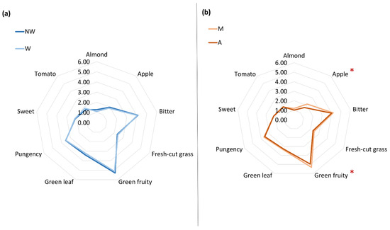 For comparative purposes, the average attributes of the different types of samples considered in this study (WM, NWM, WA, NWA) are presented in a spider graph (Figure 2). Similarly to the results reported in [29], the sensory profiles of washed and non-washed samples were nearly identical, showing no significant differences in any of the sensory attributes analyzed with respect to the treatment applied to the fruits. However, regarding the harvesting time, some differences have been observed in the sensory profile of OEVOOs from fruits collected in the morning and in the afternoon. It is noteworthy that oils obtained in the mornings presented slightly higher values for the green fruity and apple attributes (see those marked with (*) in Figure 2b). These are positive attributes highly appreciated by consumers and, therefore, related to quality.