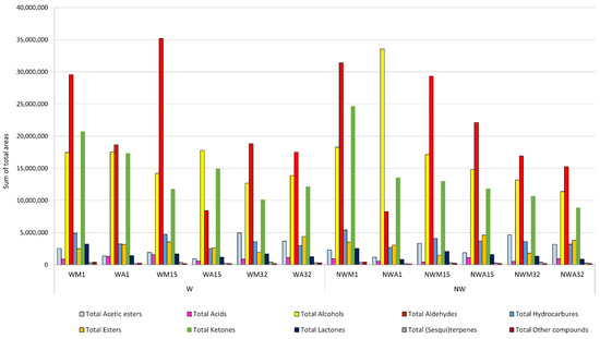 In this study, a total of 58 volatile compounds were determined. Their total peak areas, as well as their standard deviation and statistical results (obtained by performing an ANOVA regarding the time of collection, maturation stage and washing and non-washing process), are shown in Tables S1 and S2 of the Supplementary Material. Among these 58 volatile compounds, 2 were acetic acid esters, 2 acids, 14 alcohols, 11 aldehydes, 7 hydrocarbures, 4 esters, 10 ketones, 4 lactones, 2 (sesqui)terpenes and 2 are classified as “others”.