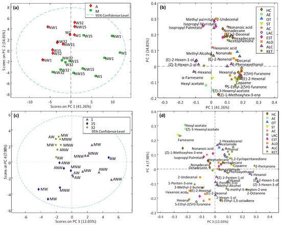 Scores (a–c) and loadings (b–d) plots of the PCA model of the first 4 principal components (PCs) obtained with the volatile compounds of the Organic Extra Virgin Olive Oil samples analyzed. PC1 vs. PC2 scores plot (a) was colored according to the time of collection, and PC3 vs. PC4 plot was colored according to the maturation stage. Notes: Morning (M) or afternoon (A), washing (W) or non-washing (NW) process; Stage I (collection day 1), stage II (collection day 15), stage III (collection day 32); HC: Hydrocarbures, AE: acetic esters, OT: other compounds, ST: (sesqui) terpenes, AC: acids, LAC: lactones, EST: esters, ALD: aldehydes, ALC: alcohols, KET: ketones.