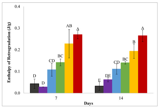 Enthalpies of retrogradation of 10%w/v wheat starch gels made with (from left to right) water (black), 10% (purple), 20% (blue), 30% (green), 40% (yellow), 50% (red) w/w sucrose solutions and incubated at 4 °C for 7 and 14 days. Error bars are 1 standard deviation and significant differences are indicated by capital letters (A–E).