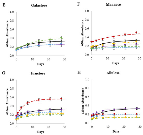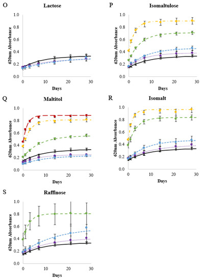 Changes in 620 nm absorbances of 10%w/v wheat starch gels stored at 4 °C over 28 days made with water (black, ×──), 10% (purple, ●∙∙∙∙∙), 20% (blue, ●----), 30% (green, ●- - -), 40% (yellow, ●- ∙ - ∙), 50% (red, ●― ―) solutions of 5-C sugars (A,B), a 5-C sugar alcohol (C), 6-C sugars (D–J), 6-C sugar alcohols (K,L), 12-C sugars (M–P), 12-C sugar alcohols (Q,R), and a 18-C sugar (S). Lines are Avrami modeled absorbance values and the error bars are 1 standard deviation of the measured absorbance values.