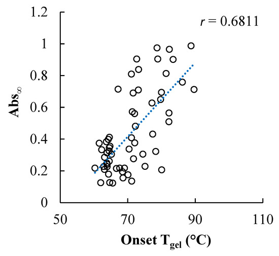 Moderate but significant correlations were found between the onset gelatinization temperature of wheat starch in the different sweetener solutions and retrogradation of the starch in gels made using these same sweetener types and concentrations (Figure 6, Table 4). The ϕw,eff was also moderately but significantly negatively correlated to Abs∞, but to a lesser extent than Tgel. Sweetener solutions that resulted in the highest onset Tgels also tended to result in the most retrogradation. Increasing the concentration of all of the sweeteners studied increased the Tgel, although the extent of Tgel elevation varied across the different sweetener types attributed to structural differences between the sweeteners, including measures of their intermolecular hydrogen bonding ability and ϕw,eff [3,4]. It is important to note that more than the temperature differential between the onset Tgel and the preparation of the gels (99 °C) affected retrogradation, as reflected in the distribution of Abs∞ values at any given onset Tgel value (Figure 6). The amount and type of sweetener in solution affected the onset Tgel and would therefore have also likely altered the amount of residual short-range molecular order in the gelatinized starch as well as the molecular mobility of the glucan chains, factors shown to be influential in retrogradation [23].