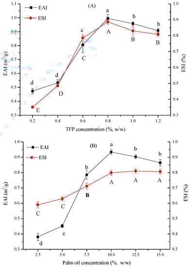 Effect of TFP (A) and oil (B) concentration on EAI and ESI. (Different lowercase and uppercase letters indicate a significant difference between EAI and ESI at p < 0.05).